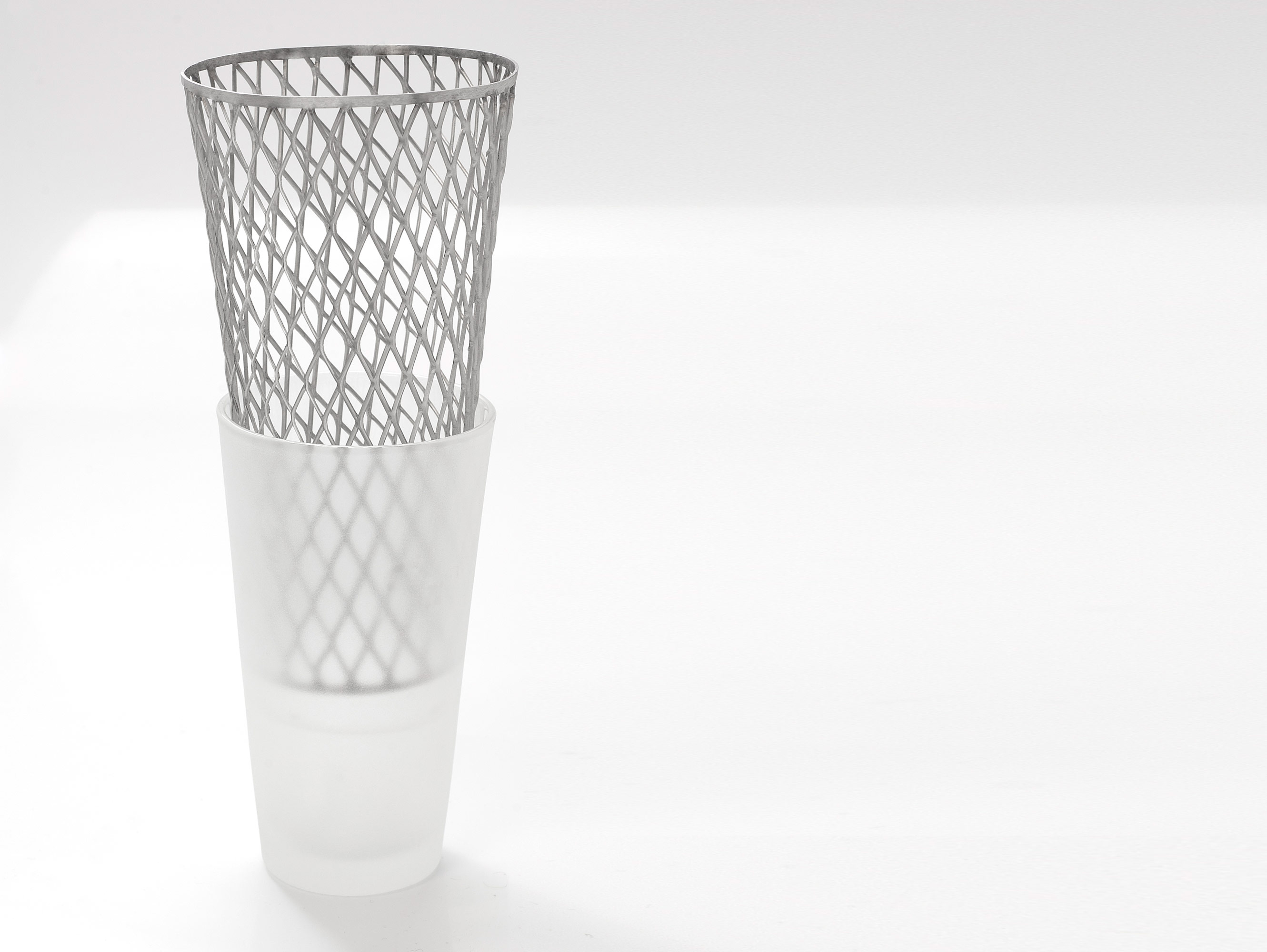 This prototype is based on two essential elements of a vase: being a basin for the water, and holding the flowers. Made out of (a Dutch beer) glass and mesh steel.